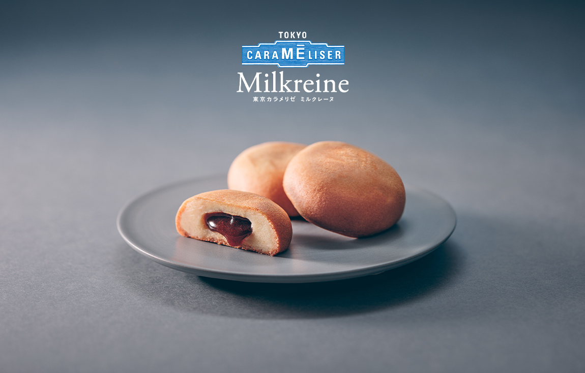 東京カラメリゼシリーズの第四弾として登場した「東京カラメリゼ ミルクレーヌ」。「カラメリゼ」(砂糖を熱して香ばしい焦がし砂糖にすること)の美味しさを追求する当シリーズの商品の中で、新しい切り口でカラメリゼを楽しむ商品です。薄皮に包まれたミルク餡の真ん中にたっぷりカラメルソースを閉じ込めるため「三重包餡製法」で作られたこのお菓子は、ミルク餡とカラメルソースがお互いを引立てて口の中でまろやかに溶け合う、ありそうでなかった味わいです。